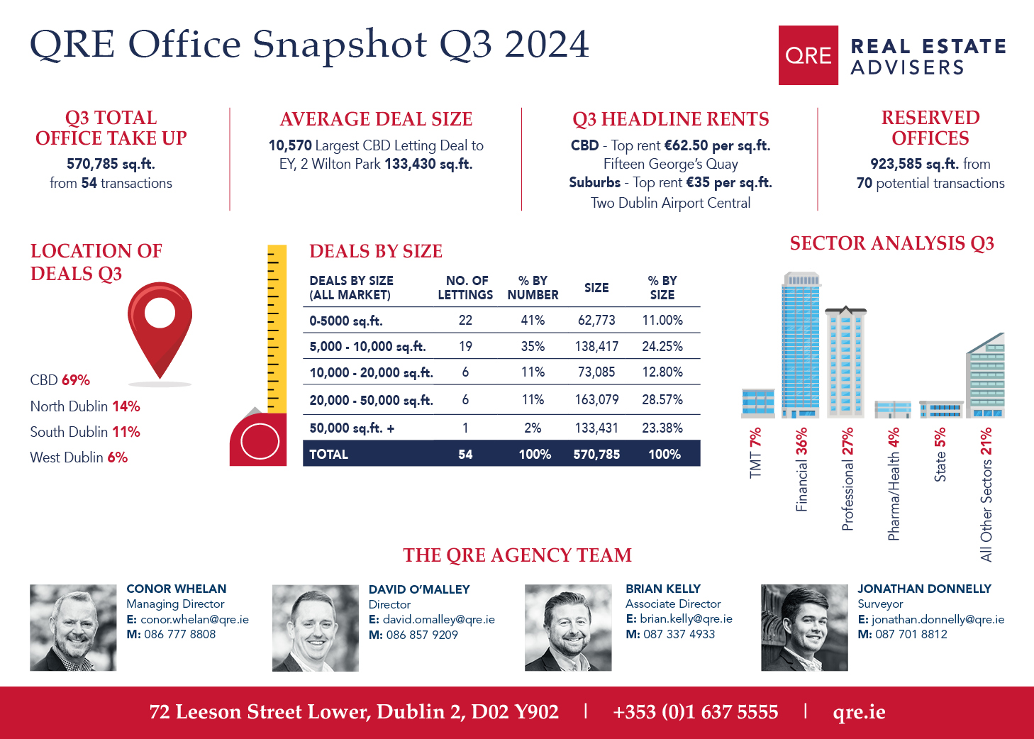 The Dublin office market saw a strong Q3, with over 570,000 Sq.ft of space taken up across 54 deals. The Finance Sector led the way, accounting for 30% of the total take-up by size, highlighted by EY's significant 133,000 Sq.ft lease at 2 Wilton Park. Notably, the return of larger deals (six transactions of 50,000 Sq.ft or more this year), signals growing market confidence, both in terms of take-up and companies encouraging staff back to the office.