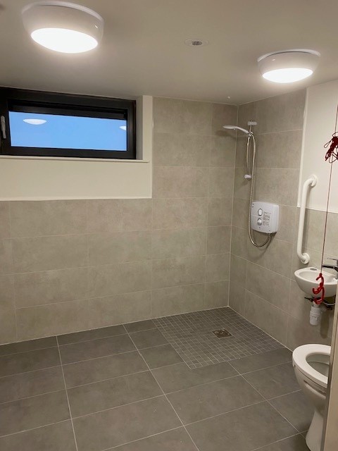 - Toilet and showers, including floor and wall tiling and white ceramic sanitary ware